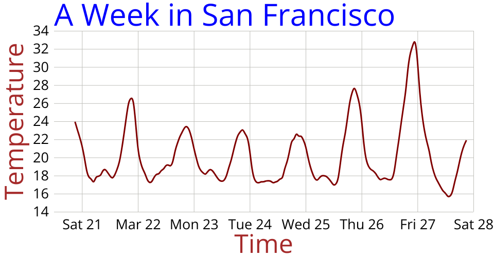 This line chart shows one week of temperature (in degrees Celcius) in San Francisco. The data comes from Data Canvas - Sense Your City.