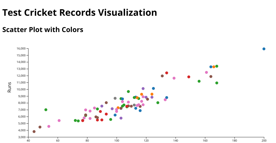 We are Displaying the TestCricket_Records dataset using Scatter plot.