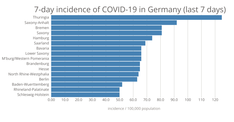 This bar chart shows the number and cumulative incidence (per 100,000 population) of laboratory-confirmed COVID-19 cases for each federal state electronically reported to the Robert Koch Institute (RKI), Germany (02/03/2021, 12:00 AM) here.