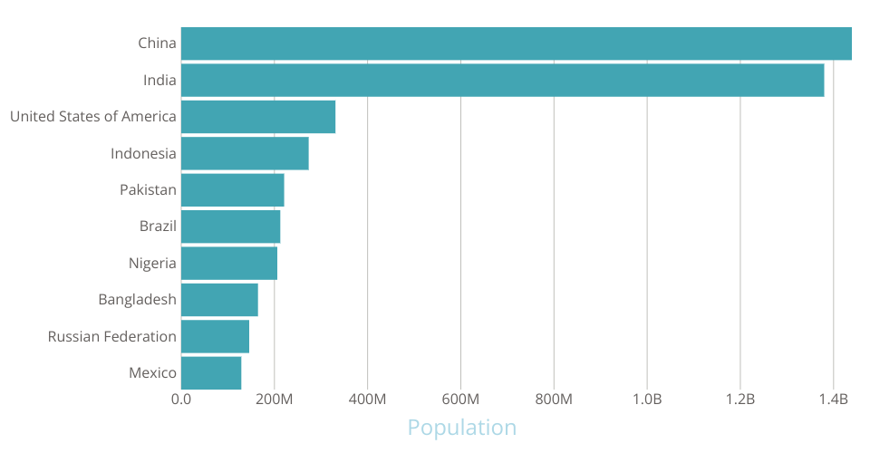 A program that shows the top 10 most populous countries as a pathetic bar chart with no axes.