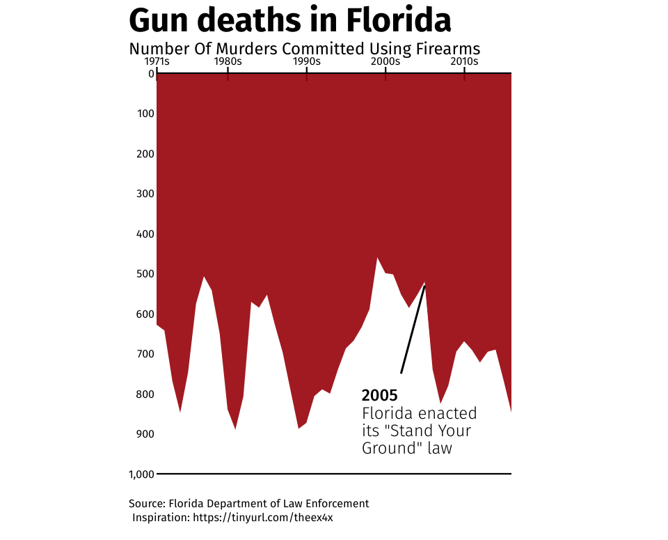 The original visualization appeared in the article This Chart Shows An Alarming Rise In Florida Gun Deaths After 'Stand Your Ground' Was Enacted article by Pamela Engel on Business Insider on February 18, 2014.