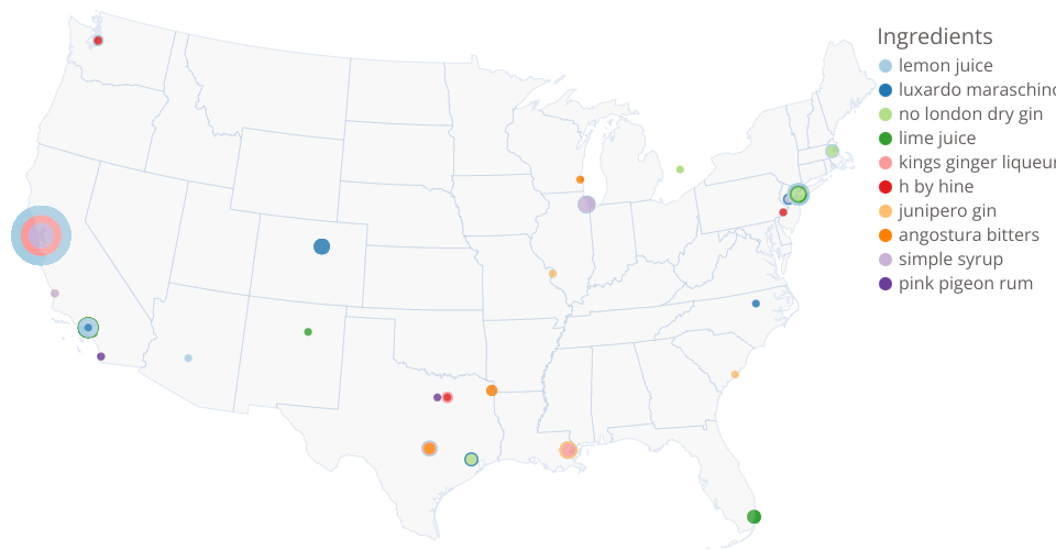 A map showing the top 10 ingredients used in cocktails across the US from the Hotaling & Co cocktails data set. Hovering over ingredients in the legend highlights them on the map.