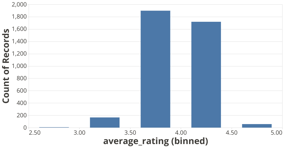 This is a histogram of all book ratings for books with > 1000 ratings based on data from the Goodreads API sourced from Kaggle