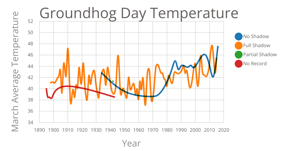 This visualization is based on the groundhog day dataset found on Kaggle.If you've watched the movie 'Groundhog Day', you'll know that many people gather in Punxsutawney, Pennsylvania, on the second day of February to await the spring forecast from a groundhog known as Punxsutawney Phil. According to legend, if Phil sees his shadow the United States is in store for six more weeks of winter weather. However, if Phil doesn’t see his shadow, the country should expect warmer temperatures and the arrival of an early spring. This line chart compares the average temperature in March between shadow, no shadow, and partial shadow to see how accurate the forecast is.
