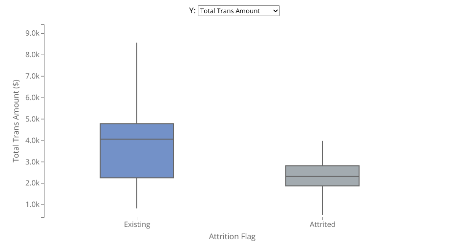 Finally, the attrition status of the customers is encoded on the color of the boxes, the users can highlight the boxes by hovering over them and see the values used to construct the boxes on the tooltip.