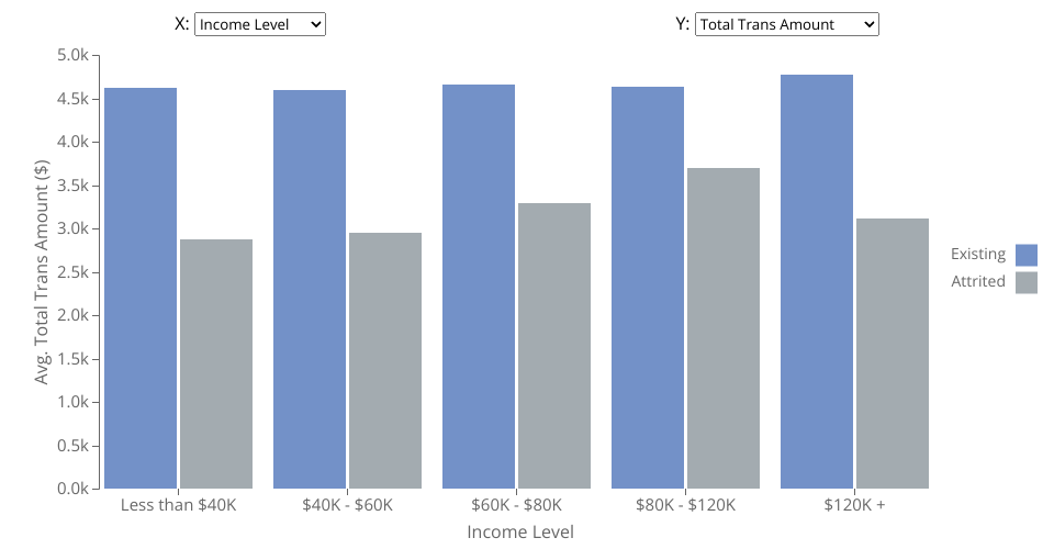 Finally, the attrition status of the customers is encoded on the color of the bars.
