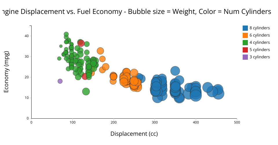 Bubble chart - Engine Displacement vs. Fuel Economy - Bubble size = weigth, Color = Num Cylinders