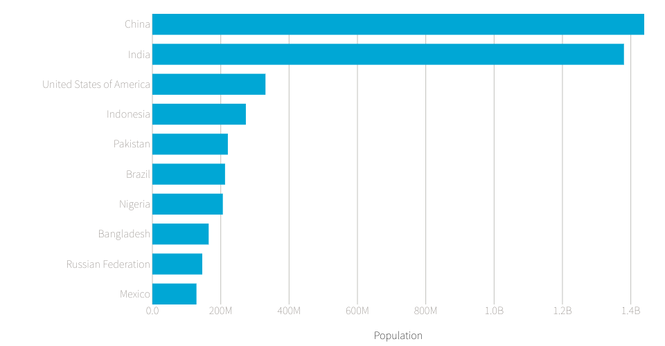 A program that shows the top 10 most populous countries as a pathetic bar chart with no axes.