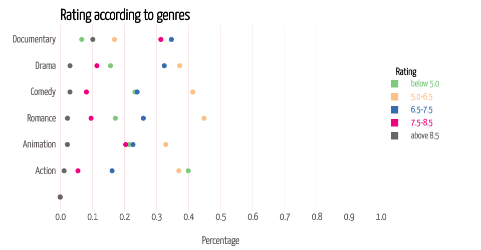 This stacked bar chart gives the percentage of each rating level within different movie genres. The aim is to show the impact of genre on movie ratings. When the mouse hovers over each bar, you can see pop-ups of accurate percentage of each rating level within each genre. Total percentage is 1, representing 100%.