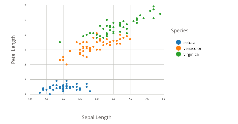 This visualization shows The Iris Dataset. It's designed to emphasize clustering by Petal Length and Sepal Length by Species.