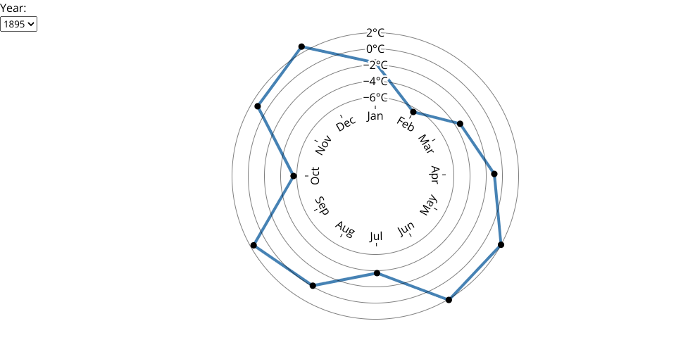 Fixed the labels January and December which were overlapping in the previous update. Plotted the points across the line. Temperature and Month for each of these points could be found by hovering over them.