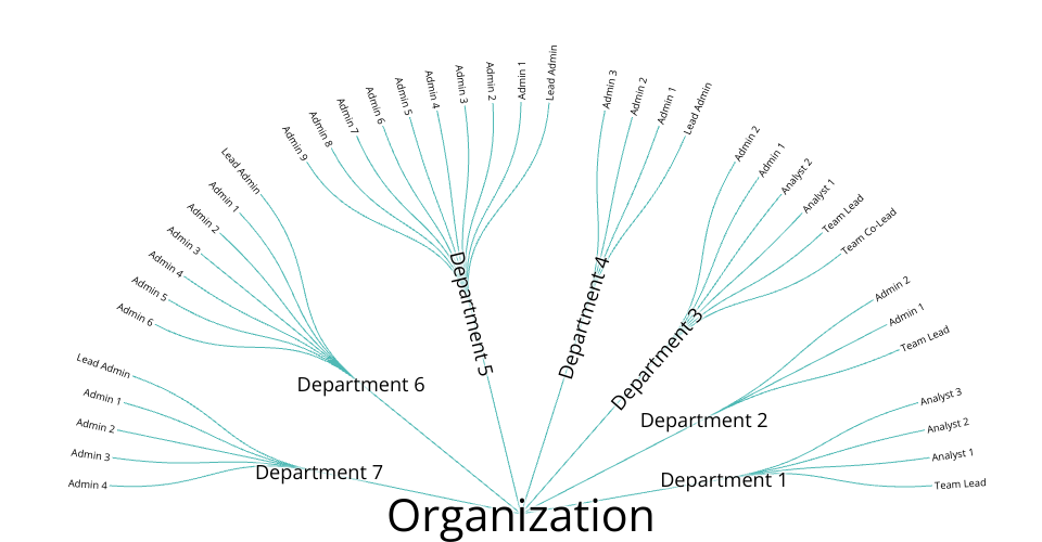 An organizational heirarchy represented as a radial tidy tree.
