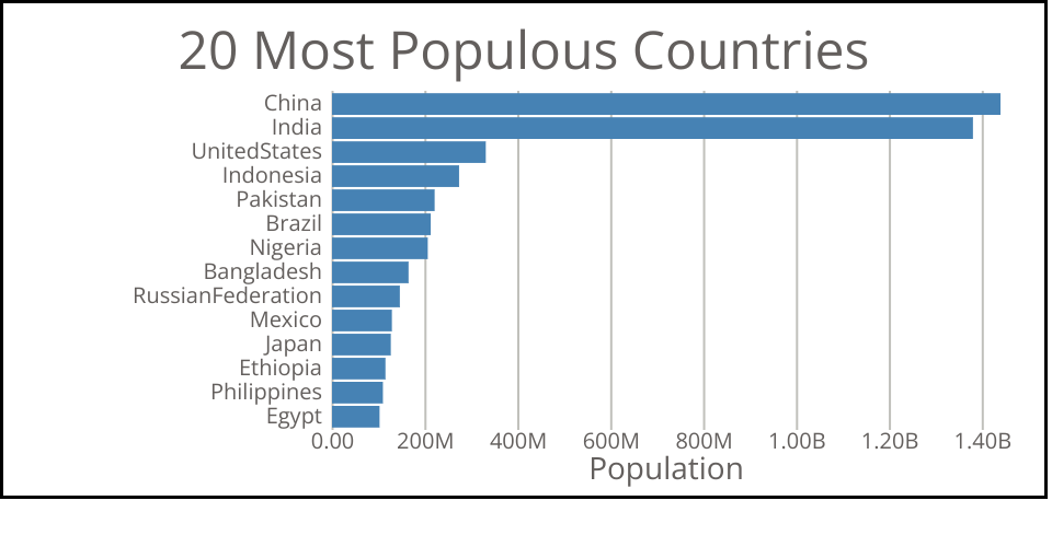 This bar chart shows population of the to 15 most populous contries. The data comes from the year 2020 estimate in United Nations: World Population Prospects 2020.