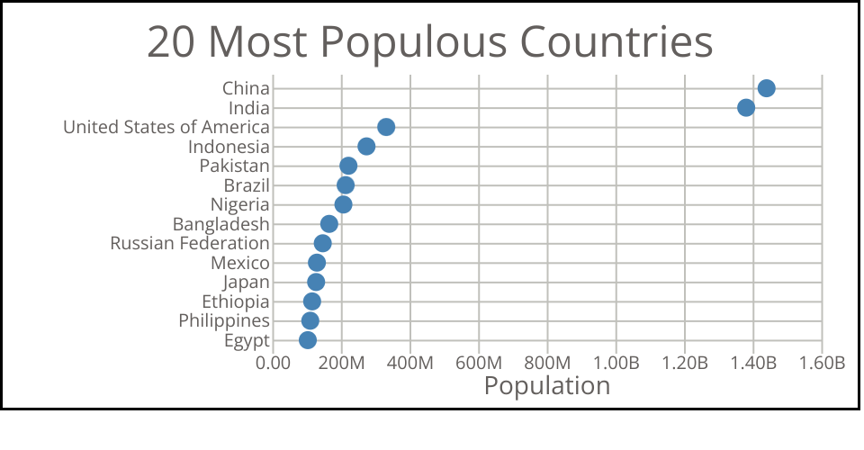 This bar chart shows population of the to 15 most populous contries. The data comes from the year 2020 estimate in United Nations: World Population Prospects 2020.