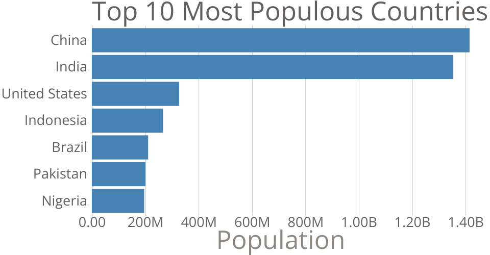 This bar chart shows population of the top 10 most populous countries. The data comes from the year 2018 estimate in United Nations: World Population Prospects 2017. It also demonstrates customization of D3 axes.