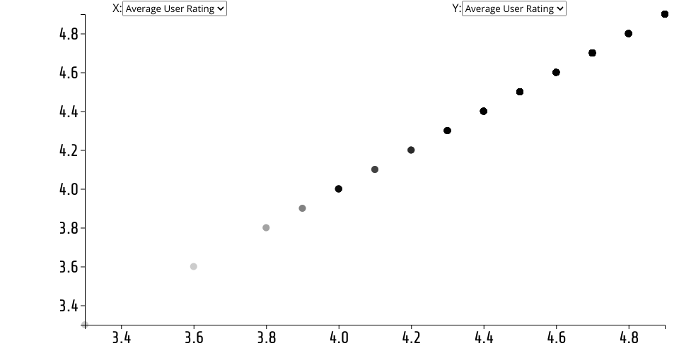 This scatter plot interactively shows user rating, price, year, and number of reviews for Amazon top 50 best selling books by year. Shows the "Amazon Top 50 Bestselling Books 2009 - 2019" data sets relationshiph between max price and year. This data set was loaded from my gist which was sourced from Kaggle.