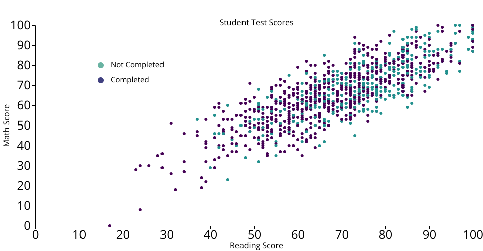 An iteration of my HTML implementation of a D3 scatter plot. Shows the relationship between math and reading scores from the "Students Performance in Exams" data set loaded from my gist, which is sourced from Kaggle. In this iteration, I've colored the scatter plot to indicate if students have completed a test prep course (Cyan) or not (Purple).