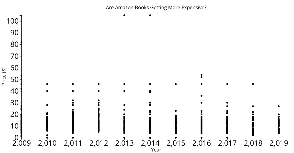 A vanilla HTML implementation of a D3 scatter plot. Shows the "Amazon Top 50 Bestselling Books 2009 - 2019" data sets relationshiph between price and year. This data set was loaded from my gist which was sourced from Kaggle.