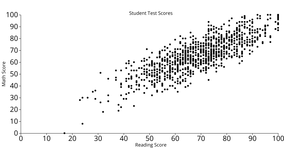 A vanilla HTML implementation of a D3 scatter plot. Shows the relationship between math and reading scores from the "Students Performance in Exams" data set loaded from my gist, which is sourced from Kaggle.