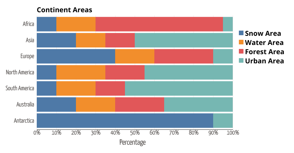 This graph represents s stacked bar chart for the area type in each continent. The areas are divided into 4 categories: Snow, Water, Forest and Urban. The total area is represented in percentages and the total percentage for each continent sums upto 100%.