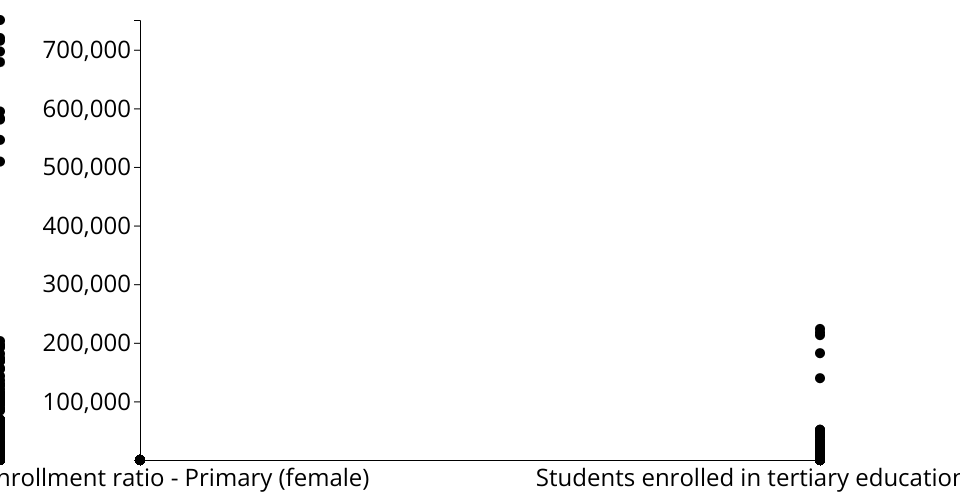 A scatterplot using the UN Primary, Secondary, and Tertiary Education dataset. The circles represent the country, while the position of the circles represent the number of students enrolled (y-axis) and whether they were enrolled in primary, secondary, or tertiary education (x-axis).