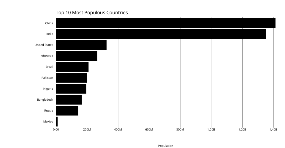 This bar chart shows population of the top 10 most populous countries. The data comes from the year 2018 estimate in United Nations: World Population Prospects 2017. It also demonstrates customization of D3 axes.
