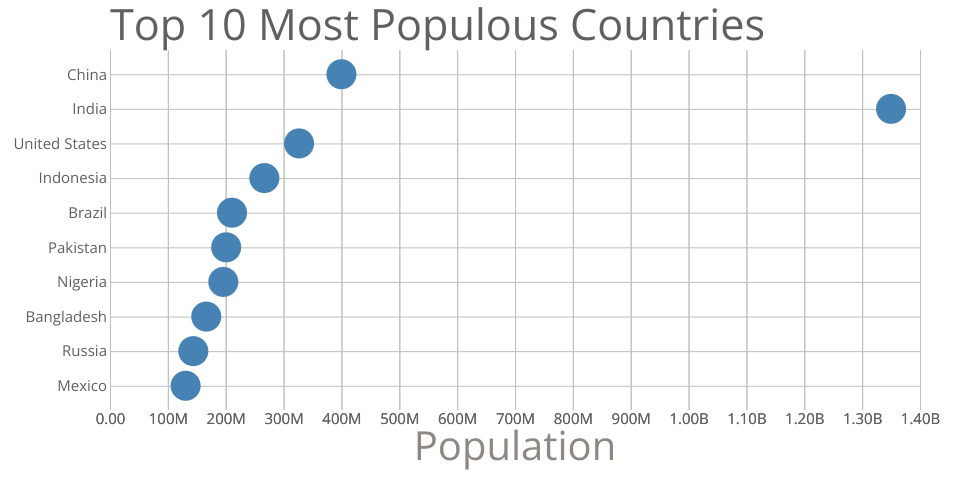 This bar chart shows population of the top 10 most populous countries. The data comes from the year 1018 estimate from the year 2018 eestimate in [World Population Prospects 2017]