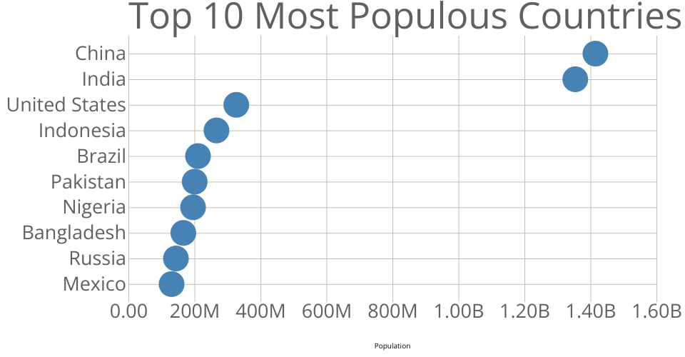 This bar chart shows population of the top 10 most populous countries. The data comes from the year 2018 estimate in United Nations: World Population Prospects 2017. It also demonstrates customization of D3 axes.