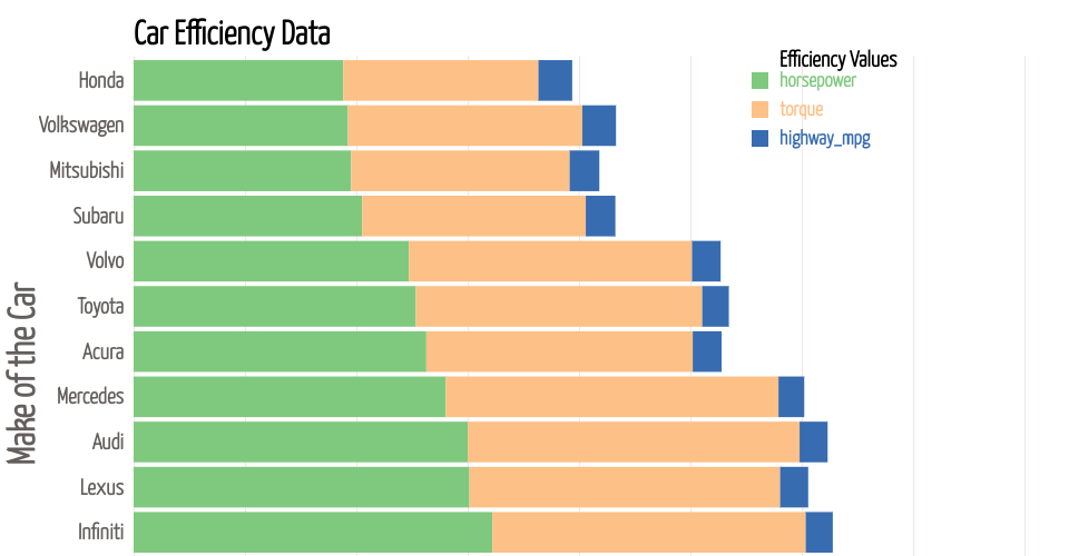 This stacked Bar grapgh gives us each car's efficiency by analyzing the values with respect to Horsepower, Torque and MPG