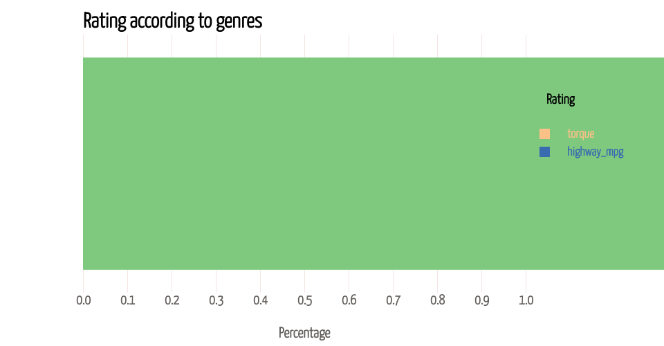 This stacked bar chart gives the percentage of each rating level within different movie genres. The aim is to show the impact of genre on movie ratings. When the mouse hovers over each bar, you can see pop-ups of accurate percentage of each rating level within each genre. Total percentage is 1, representing 100%.