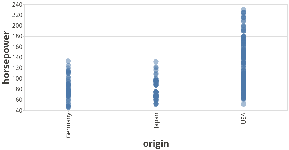 The data shown here comes from the UCI Machine Learning Repository: Auto MPG Data Set, via Gist: Scatter Plot with Menus.