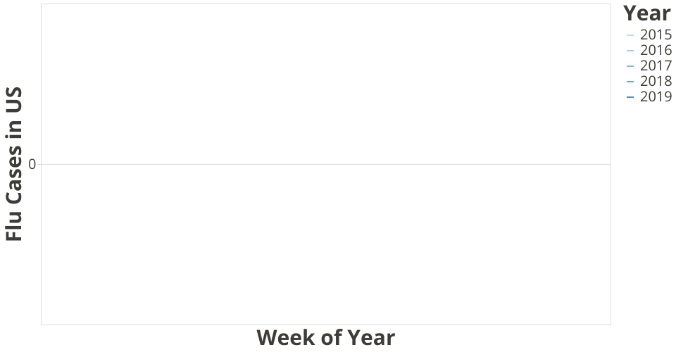 This graph shows the national ILI total cases annually. The curves from 2015 to 2019 to the present date are displayed. This plot achieves the visualization of the annual ILI total patterns in general, and also provide a direct comparison year-over-year. We can tell 2018 is the year with highest Flu cases in mid February time, while 2019 has a more stretched Flu season comparing to other years.