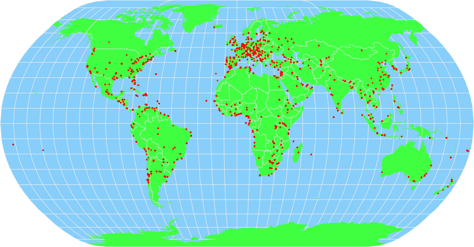 A world map showing cities that held the international football games between 2010 to 2020. International football games.