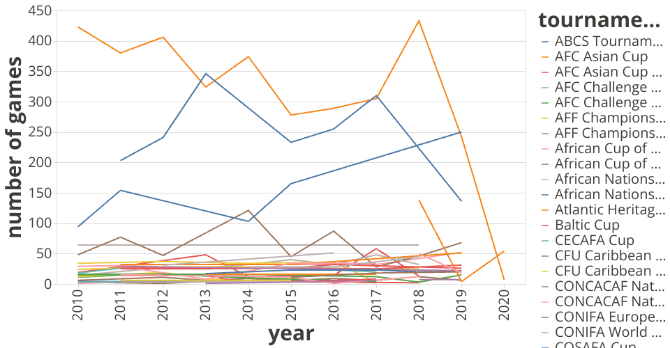 The line chart shows the number of different types of competitions from 2010 to 2020. Data:International football results.