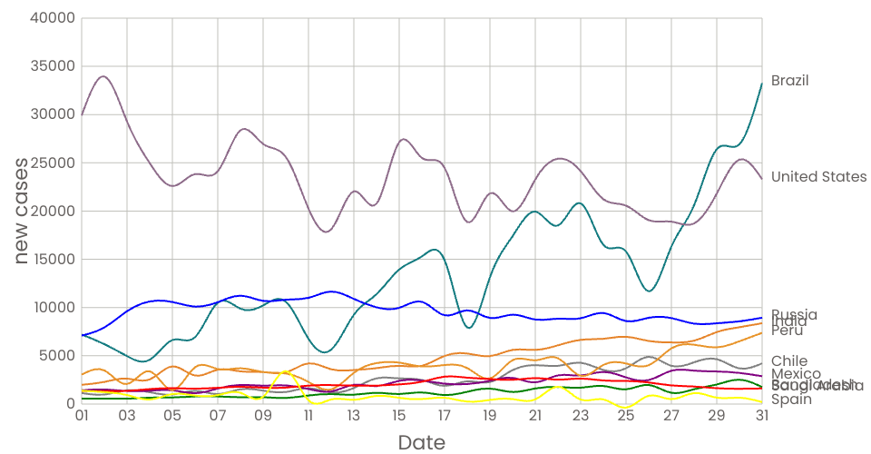 This visualization helps to see country wise line graph of new covid cases data with focus on hover over country name Covid Data is taken from The COVID MAY Dataset.