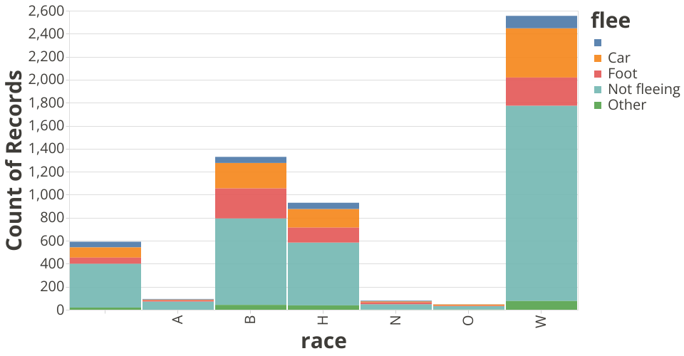 The visualization shows the count of fatal police shootings represented in a stacked bar chart, categorized by race along the X axis and color coded based on the "flee" status of the victim.