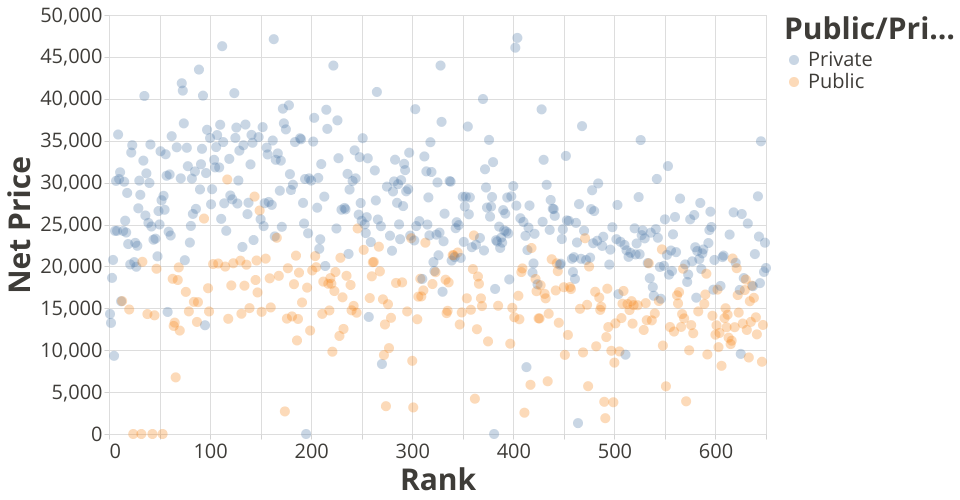 The visualization shows the distribution of colleges plotted by rank along the X axis and net price along the Y Axis. Color indicates the university is either private or public.
