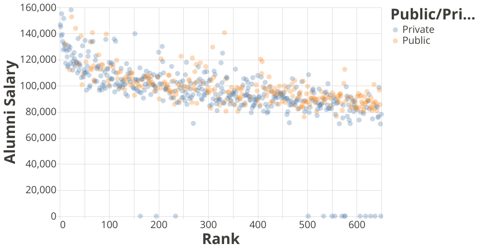 The visualization shows the distribution of colleges plotted by rank along the X axis and Alumni Salary along the Y Axis. Color indicates the university is either private or public.