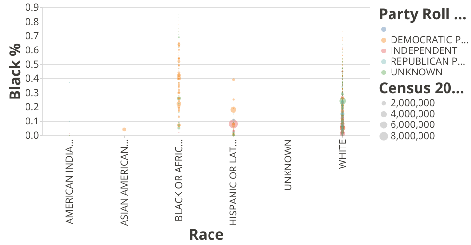 The data is categorized based on the racial identity of the Sheriff along the X axis and the percentage of the constituent population who is Black. Larger points indicate larger overall populations and point color indicates the politial party affiliation of the elected official.