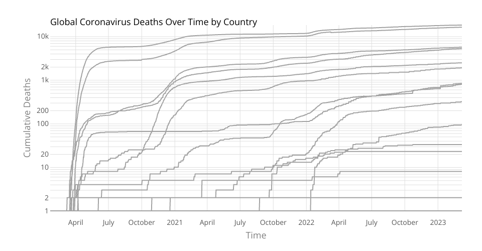 Line chart of Coronavirus cases to date, by country. Data from Johns Hopkins Coronavirus Dataset.