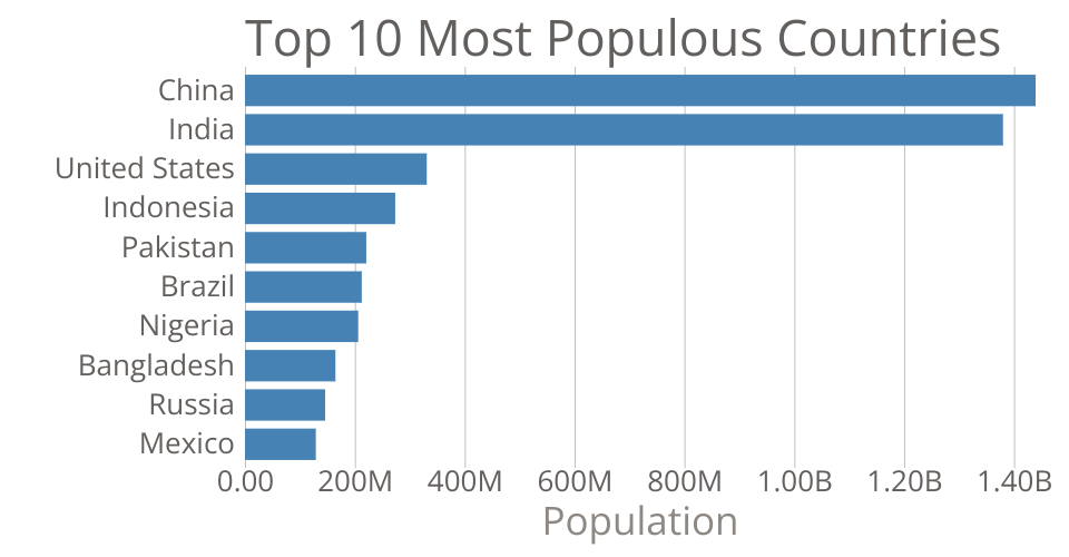 This bar chart shows population of the top 10 most populous countries. The data comes from the year 2019 estimate in United Nations: World Population Prospects