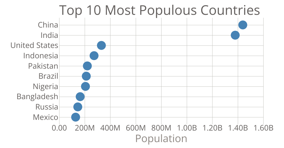 This bar chart shows population of the top 10 most populous countries. The data comes from the year 2019 estimate in United Nations: World Population Prospects