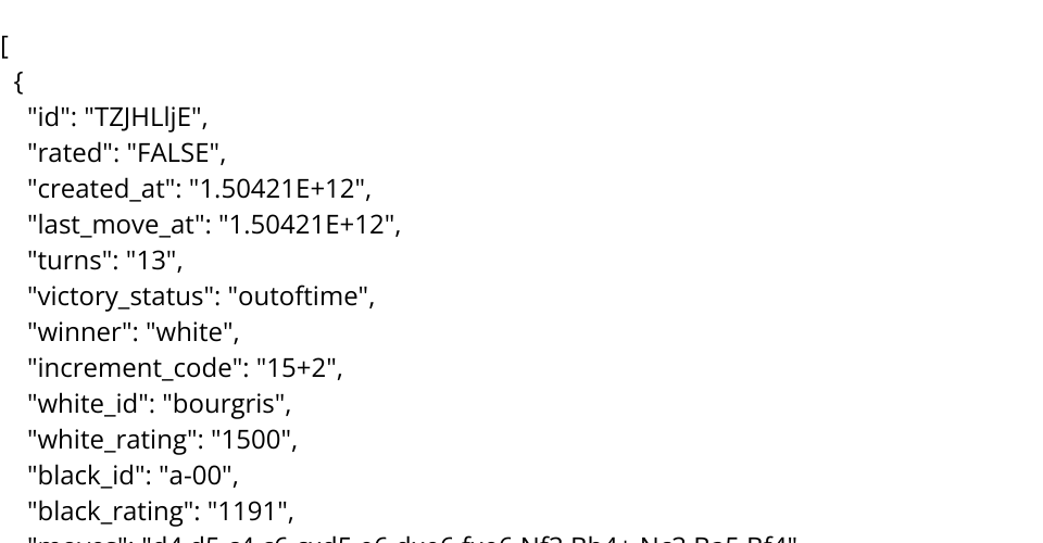 Features: Game ID: categorical Rated (T/F): categorical Start Time: quantitative End Time: quantitative Number of Turns: quantitaitve Game Status: categorical Winner: cateogrical Time Increment: quantitative White Player ID: categorical White Player Rating: ordinal Black Player ID: categorical Black Player Rating: ordinal All Moves in Standard Chess Notation: (unsure about this once since it's a list of moves) Opening Eco (Standardised Code for any given opening, list here): categorical Opening Name: categorical Opening Ply (Number of moves in the opening phase): ordinal