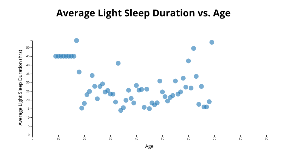 This is a viz on the sleep efficiency dataset. The question this viz aims to answer the question how does age correlate with certain feautres of the dataset. This graph looks at age vs average light sleep duration.