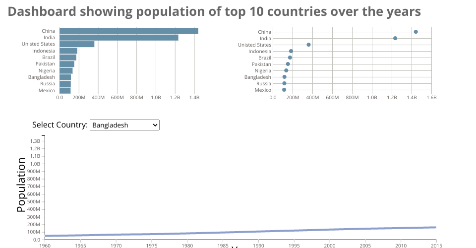 Simple dashboard consists of different charts showing the population of top ten countrie over the years.Data is taken from World Bank (https://data.world/worldbank/total-population-per-country/workspace/file?filename=POP_TOTAL_DS2_en_v2.csv)
