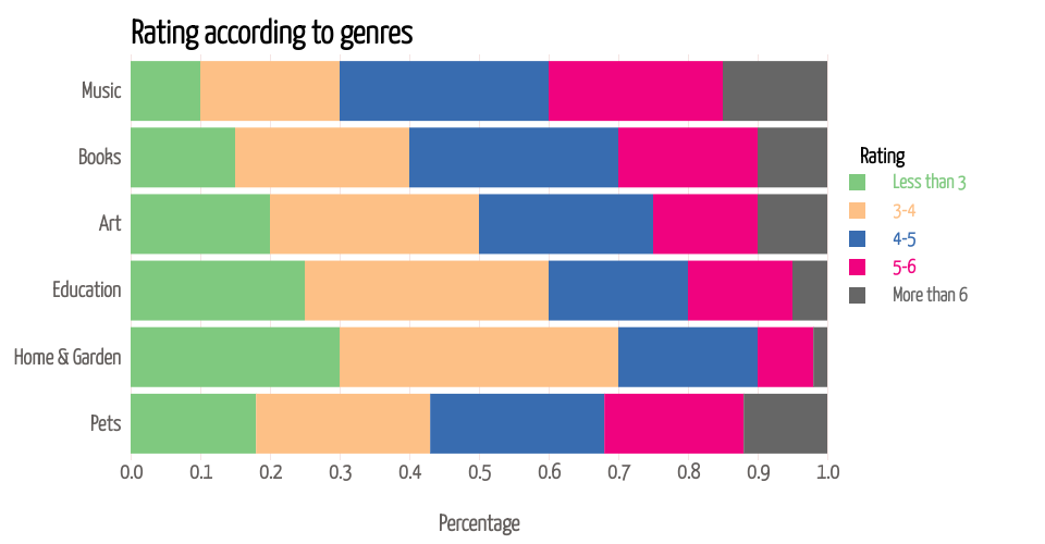 This stacked bar chart gives the percentage of each rating level within different movie genres. The aim is to show the impact of genre on movie ratings. When the mouse hovers over each bar, you can see pop-ups of accurate percentage of each rating level within each genre. Total percentage is 1, representing 100%.