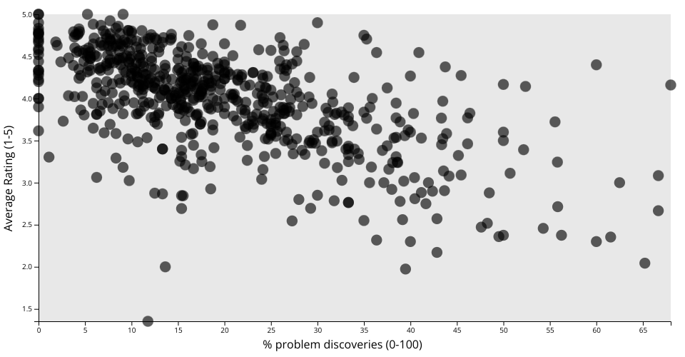Unsurprisingly this scatter plot shows a that correlates a higher percentage of problem reports to lower ratings.