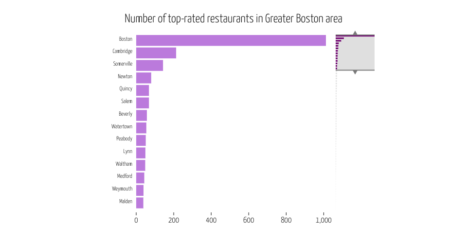 This is a brushable bar chart presenting number of top-rated restaurants in Greater Boston cities.