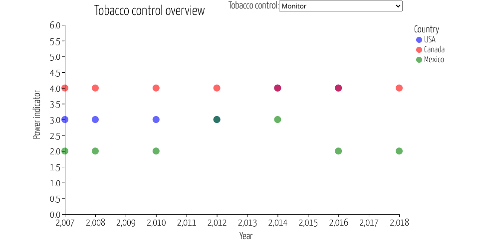 This scatter plot is to show that tobacoo control overview for three countries reported by MPOWER from 2007 to 2018.
