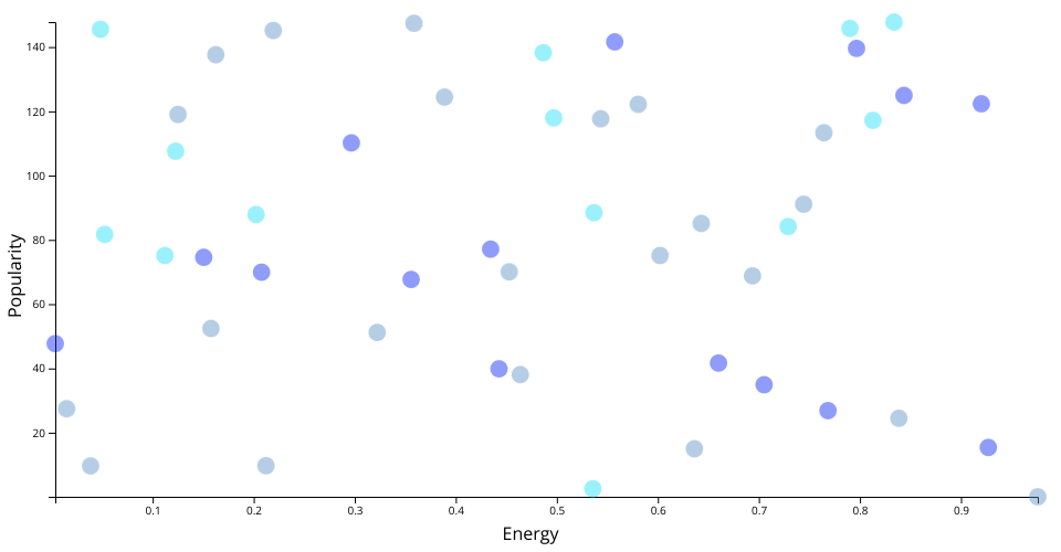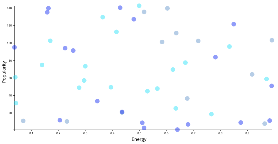 The vertical position corresponds to the song's quantified 'popularity' and the horizontal position corresponds to its 'energy' level.